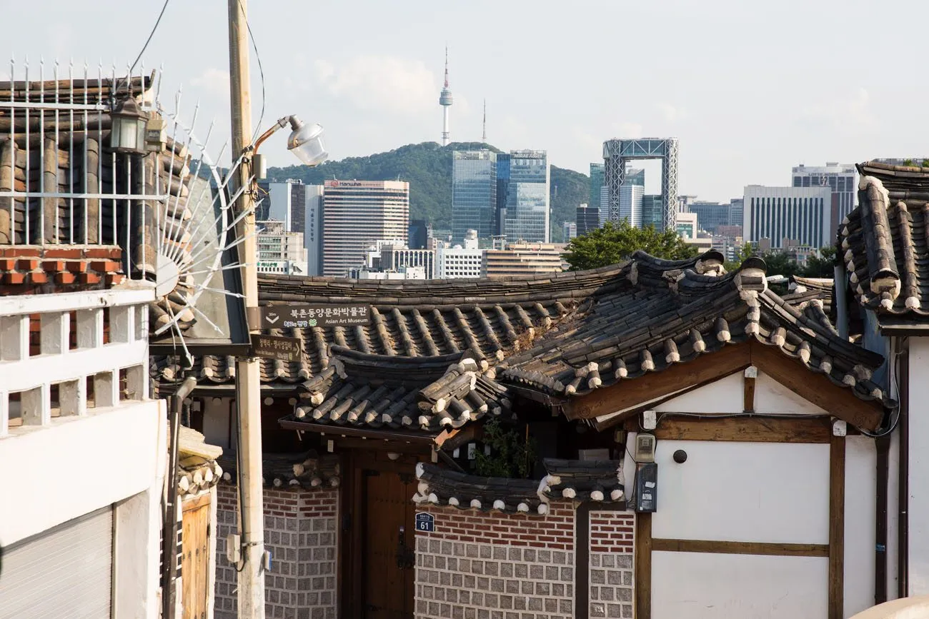 After our brief food tour we walked through the winding, historic roads in the Bukchon area of Seoul. This was a cool place to explore. Small, stone houses hidden behind stone walls lined the streets. The roofs looked like the typical tiled Chinese style roofs we saw in Beijing. There was a lot of beautiful woodwork on the upper levels of the buildings and to enter each property you had to pass through an ornate set of wooden doors. My favorite view was out over the stone rooftops to the modern city skyline of Seoul.