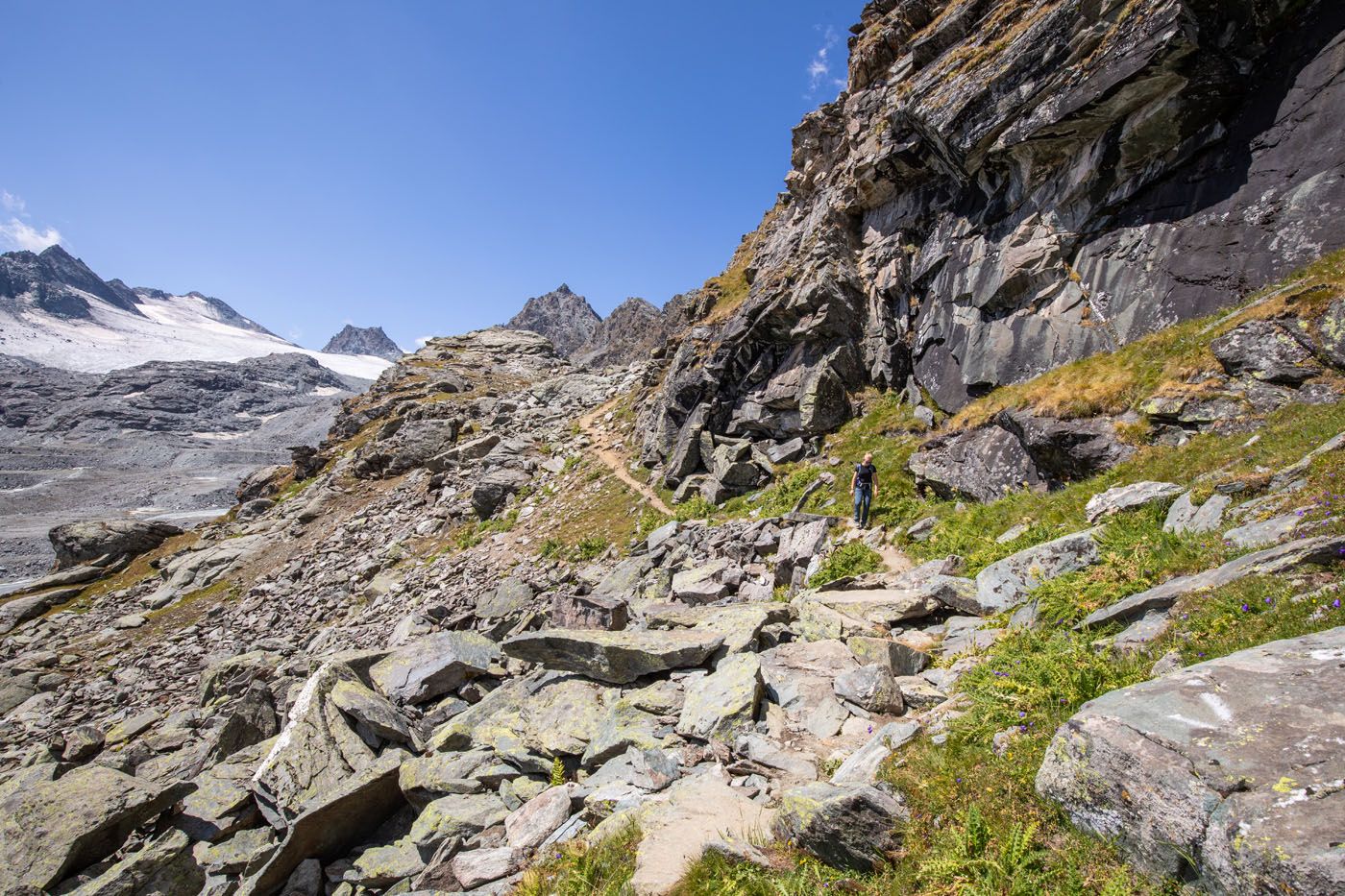 Once you start down the other side of Col de Louvie, you leave behind views of Grand Combin and the lush, green landscape. The terrain dramatically changes into mountains covered in slate gray rocks and boulders. A few receding glaciers cling to several of the highest peaks in the area.