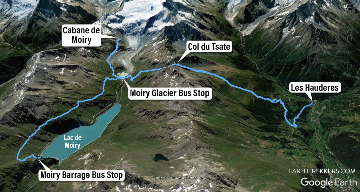 This is what we did: Les Haudères to the Moiry Glacier bus stop to the Moiry Barrage bus stop.