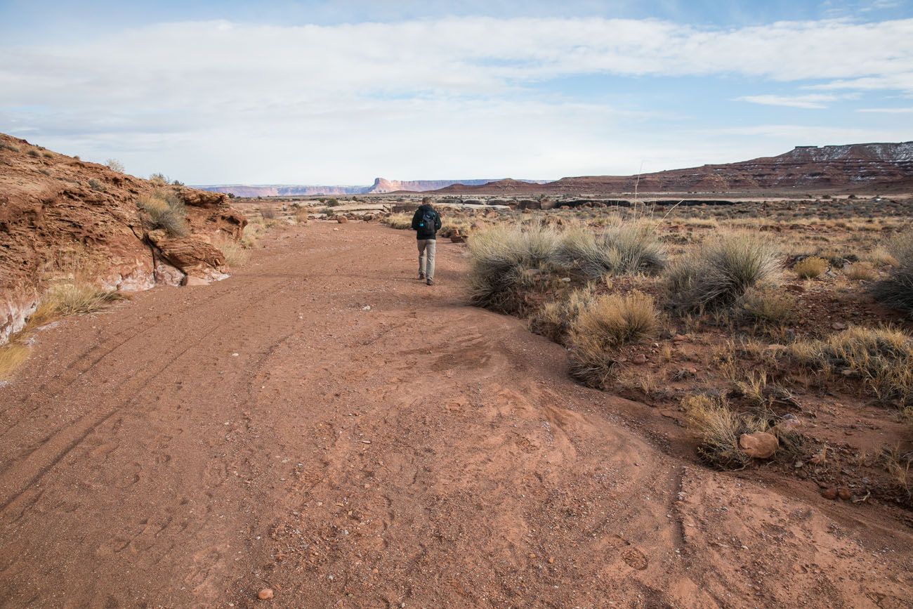 As you travel south on Grand View Point Road, there will be a left turn for a picnic area. Turn here and then park at a picnic area or at one of the limited parking spaces near the trailhead. This turn off is located 11 miles south of the Visitor Center. It is located 0.9 miles north of the Grand View Point parking lot. GPS Coordinates: 38.322752, -109.849584.