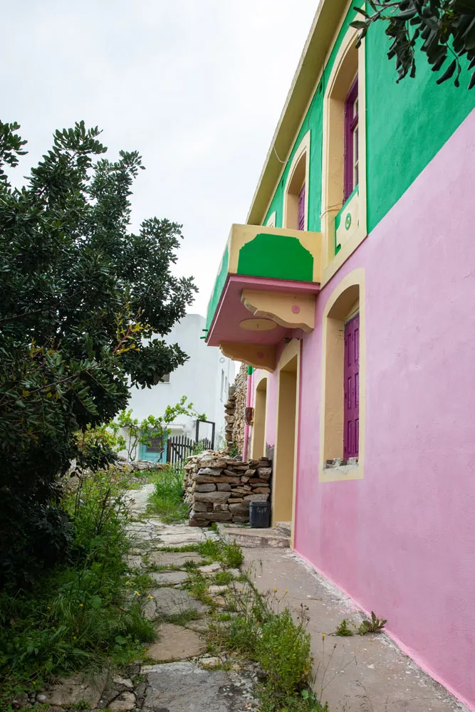 The path changes from an easy-to-follow stone path to faint, dirt trails that wander through fields of wildflowers and grassy fields. At several spots, a faint trail will break off from the “main” trail. These forks in the trail are unmarked, which had us questioning which way to go. We always stayed on the more distinct trail and this got us to Myli. If you take one of these detours, it might lead you to Kourounochori, another town that can be included in the villages walk.