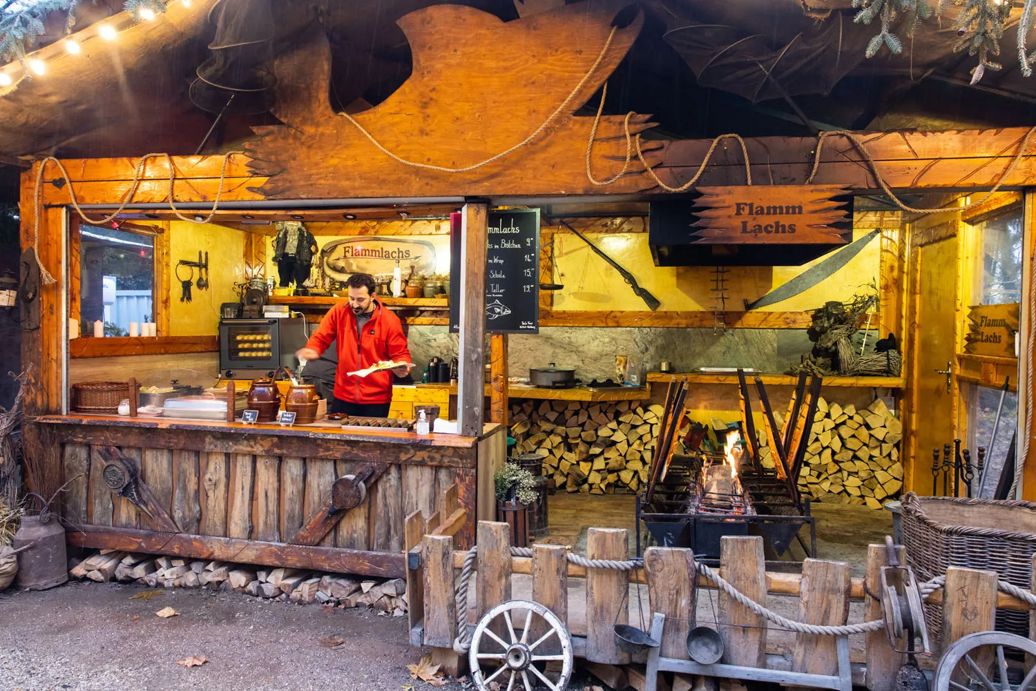 At the end of the market is the historic Malturm. The remains of this medieval defense are turned into a bar for the Christmas market. With its old stone building, wooden timbers, and open fire pit, this cozy atmosphere will make you feel like youโve stepped into a fantasy novel.