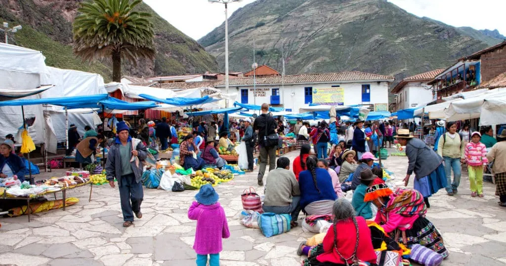 The town of Pisac, Peru is famous for its Sunday market. This is when many Peruvians do their shopping for fruit, veggies, and meat, but it is also a huge draw for tourists.