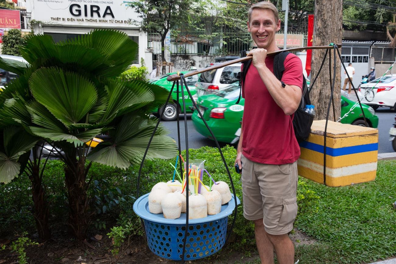Even Tim got in on the action, carrying coolers of coconuts down the street. Coconut juice is a very popular thing to drink here, especially since the coconuts are so plentiful. Just pull one down off of a coconut palm, grab a machete and chop it open, stick a straw in it and you’re good to go.